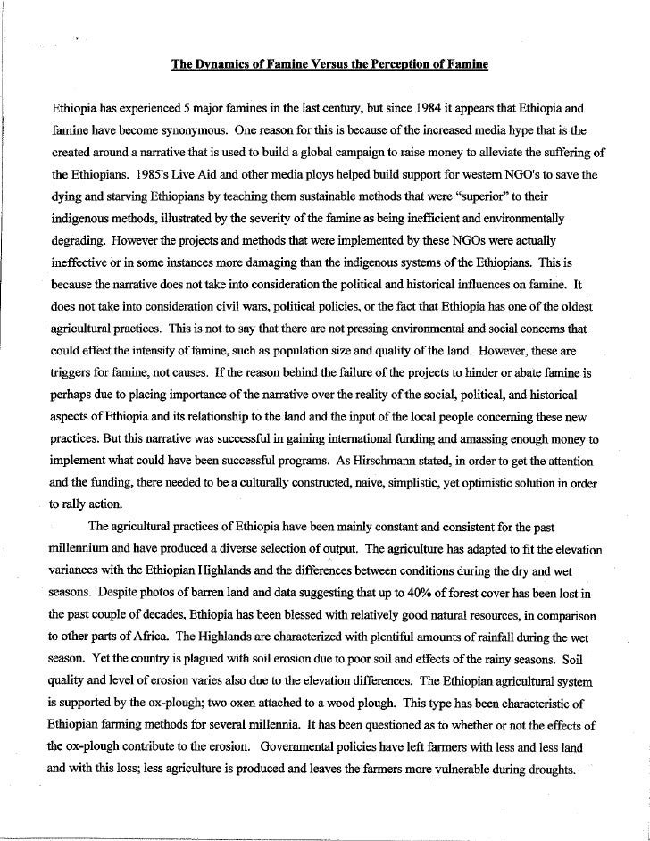 This research paper utilizes the main causes of famine, as being the poor governmental choices and civil wars that once led to famine in the past, and the effects that natural disasters like droughts has on increasing the speed rate that famine spreads in A famine is a social and economic crisis usually increased by extensive malnutrition, starvation, epidemic and increased mortality. Famine is not only in food!! It is in water also. Famine happened because drought, crop failure and other causes represented through war Famine Essay. Famine Famine can be defined as a temporary failure of food production or distribution systems in a particular region that leads to increased mortality due to starvation and diseases that result from lack of food. Famine is a very serious crisis that must be solved because famine leads to many hunger-related deaths worldwide